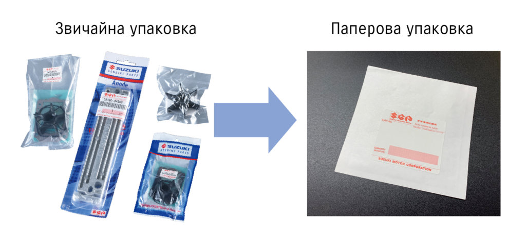 Ми почали замінювати пакувальні матеріали з пластикових на паперові для деяких оригінальних деталей для водно-моторних виробів Suzuki, починаючи з поставок у вересні 2020 року.