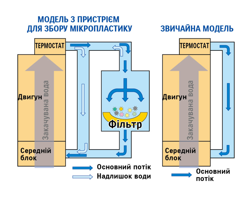 підвісного мотора, який закачує тонни морської води для охолодження двигуна, а потім повертає її в океан. Ми розробили спеціальний пристрій, який збирає мікропластикові відходи, використовуючи воду, що викидається з мотора. За допомогою цього пристрою можна збирати мікропластикові відходи на водній поверхні, просто керуючи човном.