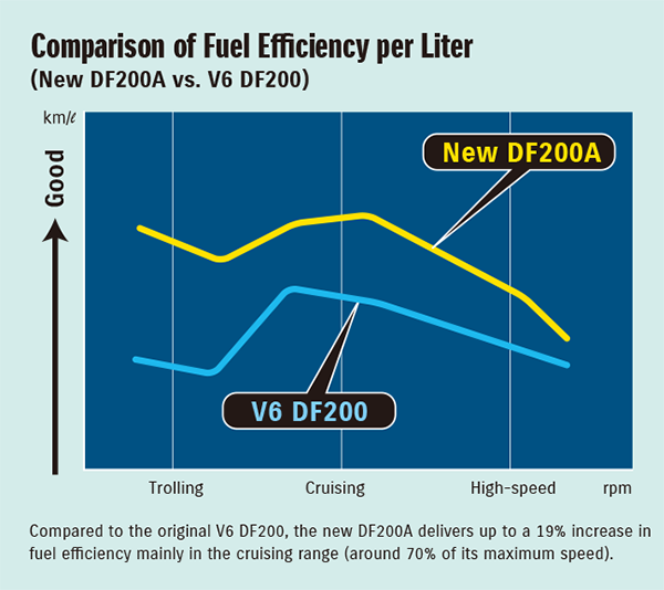Робочий об’єм циліндрів двигуна має прямий вплив на швидкість прискорення і крутний момент. Взагалі кажучи, чим більший об’єм, тим краще. З цієї причини мотор DF200A спроектовано з робочим об’ємом циліндрів 2867 куб.см, що робить його найбільшим чотирициліндровим чотиритактним підвісним мотором у класі потужності 147 кВт (200 к.с.).