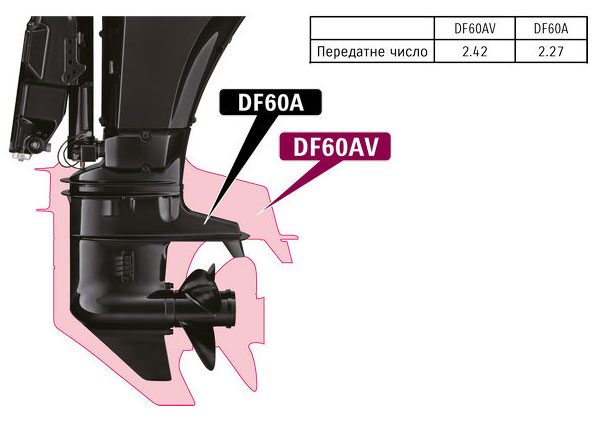 Блок двигуна розміщено ближче до передньої частини, таким чином центр ваги підвісного мотора змістився вперед.